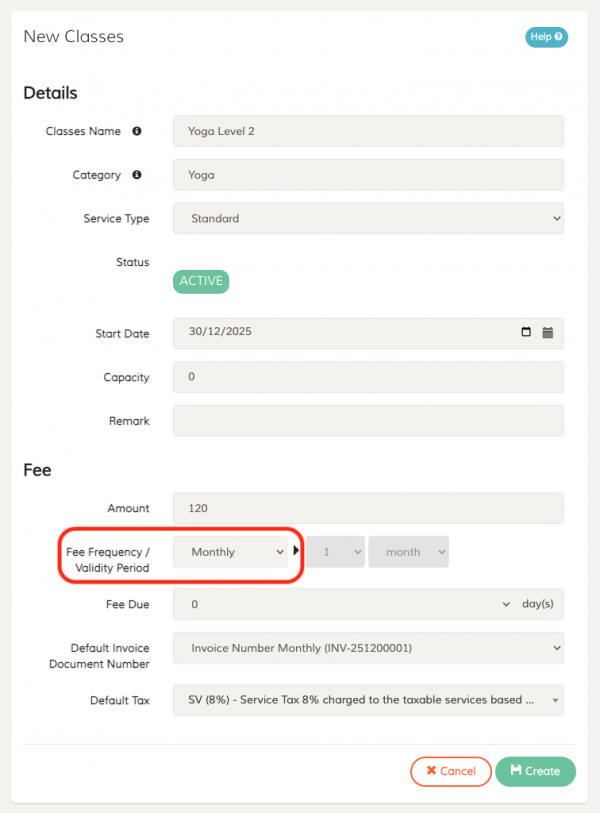 Important: To create a subscription service, the fee frequency must be set to anything other than “NA.”
