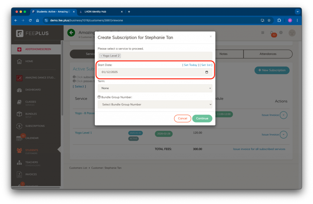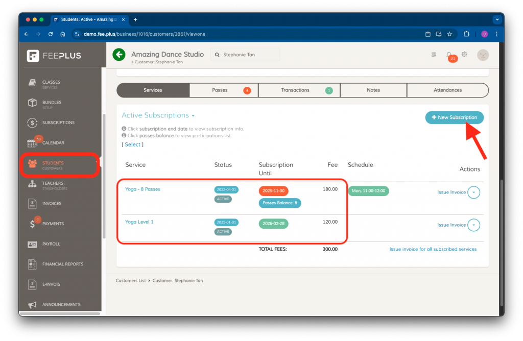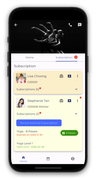 Subscriptions allow your center to track active packages and renewal cycles for each customer. These records also power what parents and students see in the FeePlus Client App — including subscription start dates, expiry dates, and payment history.